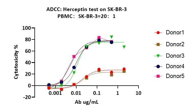 ÒÔSK-BR-3Ϊ°Ðϸ°û£¬Ö±½ÓʹÓ÷ÖÀëµÄPBMC×÷ΪЧӦϸ°û½øÐеÄADCCʵÑ顣ͨ¹ý¼ì²âÈéËáÍÑÇâø£¨LDH£©²â¶¨Ï¸°ûɱÉËЧ¹û¡£É¸Ñ¡ÊµÑéÖУ¬¶à¸öÅú´ÎµÄPBMC³ÊÏֽϺõÄADCC·´Ó¦¡£