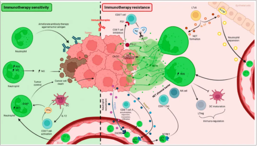 Ö×Áö΢»·¾³£¨TME£©Í¨³£¾ßÓÐÒÖÖÆÃâÒß×÷Ó㬰©Ö¢ÃâÒßÁÆ·¨µÄÄ¿±êÊÇÔöÇ¿ÃâÒßϵͳÒÔʶ±ðºÍ¹¥»÷°©Ï¸°û¡£Ö×ÁöÖÐÃâÒßµ÷½Úϸ°û£¨°üÀ¨ÖÐÐÔÁ£Ï¸°û£©ÓëÃâÒßÁÆ·¨µÄ¾ÖÏÞÐÔÖ±½ÓÏà¹Ø¡£×î½üµÄÑо¿±íÃ÷£¬»¼ÕßµÄѪÇåºÍÖ×ÁöÖÐCXCL8/IL-8ˮƽµÄÉý¸ß£¬ÒÔ¼°Ö×ÁöÖÐÖÐÐÔÁ£Ï¸°ûµÄÔö¼Ó£¬ÓëÉú´æÊ±¼äËõ¶ÌºÍ¶ÔÃâÒß¼ì²éµãÒÖÖÆ¼Á£¨ICI£©µÄÁÙ´²·´Ó¦½µµÍÏà¹Ø¡£È»¶ø£¬ÔÚÁÙ´²Ç°Ä£ÐÍÖУ¬ÖÐÐÔÁ£Ï¸°ûÔÚICIÁÆÐ§Öз¢»ÓÁËË«ÖØ×÷Ó㬼ȿÉÄܶԿ¹ICIµÄÁÆÐ§£¬Ò²¿ÉÄܲÎÓëICIºó¶Ô°©Ï¸°ûµÄɱÉË¡£