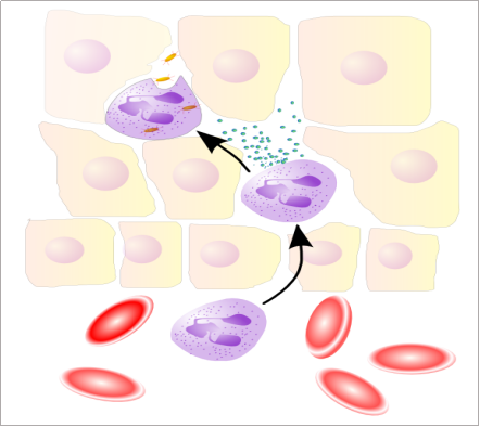 ¹ÇËèÊÍ·ÅÖÐÐÔÁ£Ï¸°ûÊܵ½Ñϸñµ÷¿Ø£ºÇ÷»¯Òò×Ó¿ØÖÆÖÐÐÔÁ£Ï¸°û½øÈëÑ»·¡£ÖÐÐÔÁ£Ï¸°ûµÄÇ÷»¯Òò×ÓÓÐÁ½ÀࣺһÊÇ×ÔÉí×éÖ¯ËðÉËÊͷŵÄÒò×Ó£¬ÀýÈ罺ԺÍÏËάµ°°×Ƭ¶Î¡¢²¹Ìå»î»¯²úÎï¼°ÃâÒßϸ°ûÒò×ÓµÈ;ÁíÒ»ÊÇ΢ÉúÎïÀ´Ô´µÄº¬ÓÐN-Ôçõ£µ°°±Ëá²Ð»ùµÄ¶àëÄ¡£ÊÜÇ÷»¯Òò×Ó×÷Óúó£¬ÖÐÐÔÁ£Ï¸°û±íÃæµÄL-Ñ¡ÔñËØ(selectin)ÊýÁ¿Ôö¼Ó£¬Ñª¹ÜÄÚÆ¤Ï¸°û¿ªÊ¼±í´ïP-»òE-Ñ¡ÔñËØ£»ÖÐÐÔÁ£Ï¸°ûѸËÙ±í´ïÕûºÏËØ(intergrin)£¬ÀýÈçMAC-1ºÍLFA-1µÈ£¬ÓëÄÚÆ¤Ï¸°ûµÄÅäÌå½áºÏ¿ÉʹÖÐÐÔÁ£Ï¸°û±ä±â£¬½ôÃÜÕ³ÌùÄÚÆ¤Ï¸°û£»¼Ì¶øÖÐÐÔÁ£Ï¸°û±äÐÎÒÆ³öѪ¹ÜÍ⣬ÒÔ°¢Ã×°ÍÔ˶¯µÄ·½Ê½ÏòÇ÷»¯Ô´Òƶ¯¡£ÕâÖÖ¹ý³Ì¶à·¢ÉúÔÚëϸѪ¹Ü΢¾²ÂöѪÁ÷»ºÂý´¦¡£