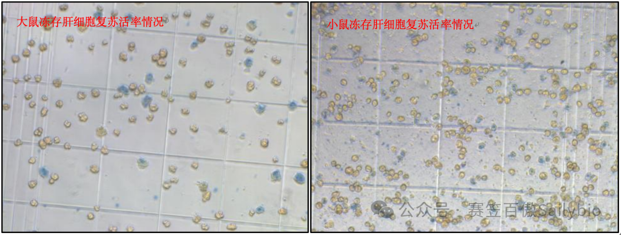 冻存的大/小鼠肝细胞复苏后,经台盼蓝染色处理,显微镜下检测细胞活率均在90%以上。