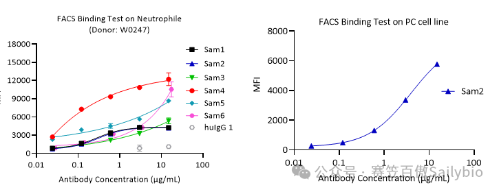 流式检测结果显示,6个待测样品均与中性粒细胞有不同程度的结合,阳性对照组中Sam2与PC cell line有明显的结合。