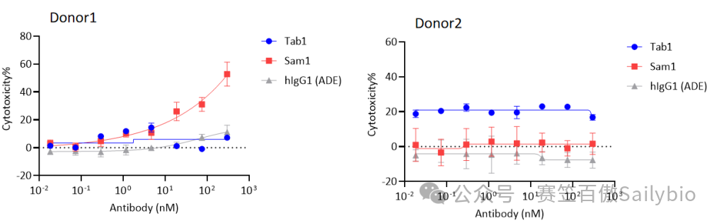 将中性粒细胞、293-BDCA2与不同浓度的待测分子共孵育后,用LDH检测方法ADCC效应,实验结果显示:待测分子(Hu005-08)可介导编号为W0888的donor的中性粒细胞产生剂量依赖的ADCC效应。