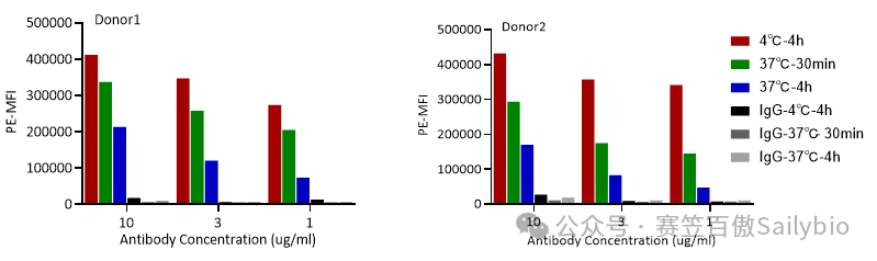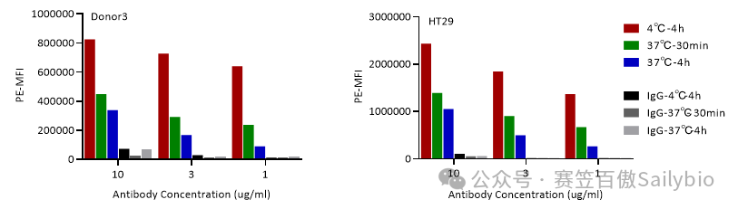 将中性粒细胞或HT29细胞(阳性对照细胞)分别与待测分子或阴性对照分子共孵育后,使用流式细胞仪检测结合在中性粒细胞或者HT29表面的剩余待测分子荧光强度:对比阴性对照分子,待测分子1和待测分子2在37℃孵育条件下,均可被HT29或不同donor的中性粒细胞内吞,且随孵育时间增加(0.5h-4h),内吞效果明显增加。